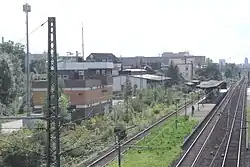 Blick auf den Bahnhof von der weiter östlich liegenden Omegabrücke über B 40, Bahnanlagen und Kilianstädter Straße