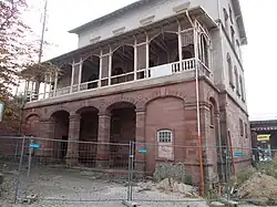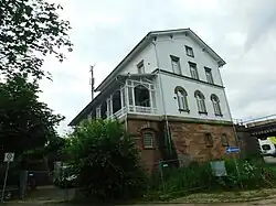 Das Bahnhofsgebäude, ein dreigeschossiger Putzbau mit Sandsteinportikus und hölzerner Überdachung zur Straßenseite, wurde 1872/73 erbaut und steht unter Denkmalschutz.[10]
