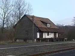 Das Empfangsgebäude beruht auf einem Typenentwurf von Alois Holtmeyer. Der zweigeschossige Putzbau liegt auf der Dorfseite traufenständig südlich der Strecke und besitzt einen Basaltsockel sowie ein mit Schiefer gedecktes Satteldach. Dabei befindet sich straßenseitig an der südwestlichen Ecke des Empfangsgebäudes ein Zwerchhaus, beidseitig – jeweils mittig angeordnet – eine kleine Fledermausgaube. Ebenfalls geschiefert ist der Giebel mit ausgeführtem Fußwalm. Südöstlich anschließend befindet sich ein zum Empfangsgebäude gehörender eingeschossiger Anbau mit verschiefertem Walmdach. Gleisseitig befindet sich dort eine kleine offene Wartehalle.