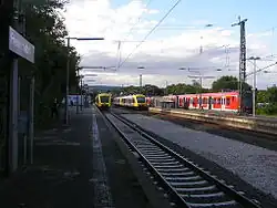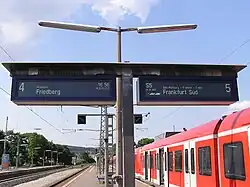 - Gleis 5 ist ebenso ein Durchgangsgleis. Die Regionalbahnlinie RB16 steht hier bereit. Die durchgehenden Züge der RB15 aus Frankfurt/Main halten hier, um mit den Zügen aus dem Taunus zu kreuzen.