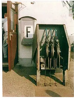 1955 wurde ein mechanisches Stellwerk der Bauform Einheit mit Wechselstromblock in Betrieb genommen,[3] mit welchem die drei Weichen gestellt wurden. Das Hebelwerk mit Wetterschutz befand sich vor dem Bahnhofsgebäude. Das Stellen der Weichen übernahmen die Zugführer der Züge. Das Stellwerk wurde 1990 außer Betrieb genommen.[3]