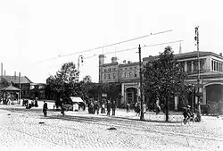 Das Bahnpostamt im Empfangsgebäude erreichte bald seine Kapazitätsgrenzen. Im Jahr 1886 entstand an der Bahnhofstraße zwischen Bahnhofsvorhalle und dem BGE-Lokschuppen für 29.000 Mark ein neues einstöckiges Bahnpostamt. 1877 wurde an der heutigen Sattigstraße zwischen Jauernicker Straße und Melanchthonstraße eine bahneigene Gasanstalt zur Leuchtgasversorgung des Bahnhofs und der Personenwagen errichtet.[11] Sie verfügte über einen eigenen Gleisanschluss zum Transport von Kohle und Abtransport von Teer über eine Wagendrehscheibe. Bis Juni 1913 blieb das Werk in Betrieb. Neben diesen bahntechnischen Einrichtungen entstanden auch kommunale Einrichtungen in unmittelbarer Nähe des Bahnhofes, z. B. der städtische Packhof an der Bahnhofstraße Ecke Salomonstraße, der am 1. Oktober 1850 mit einer Lagerfläche von 2892 Quadratmetern eröffnet wurde. Die Stadt besaß seit 1834 das Packhofrecht, also das Recht, ein von der Zollverwaltung kontrolliertes und zur Niederlage von unverzollten Waren der Kaufleute bestimmtes Lager einzurichten. Einige Kaufleute wünschten sich schon bald einen neuen Packhof näher an den Gleisen, der im Jahr 1873 als Anbau an den preußischen und österreichischen Zollschuppen den Betrieb aufnahm. Er war mit 2379 m² kleiner als der alte Packhof. Die Lagerflächen wurden mit einer dreimonatigen Kündigungsfrist vermietet. Während des Bahnhofsumbaus zwischen 1906 und 1917 musste der Packhof im Jahr 1913 wieder an seinen Ursprungsort zurückkehren.[10]
