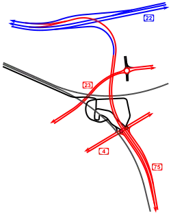 / כְּבִישׁ 75) kreuzen, welch letztere als Hochstraße die Merkasit haMifratz überspannt[1] und den Anschluss zur Golfroute (נְתִיבֵי הַמִּפְרָץ, eigentlich כְּבִישׁ 22 עוֹקֵף קְרָיוֹת Kvisch