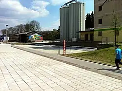 Ehemaliges Lagergebäude und Silos des Bahnhofs Heiligenhaus mit Panoramaradweg (Trasse Niederbergbahn), vom Westen aus gesehen