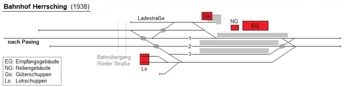 In Herrsching waren von Beginn an drei Hauptgleise westlich des Empfangsgebäudes vorhanden, die an einem Hausbahnsteig und zwei Zwischenbahnsteigen lagen. Östlich der Hauptgleise befand sich nördlich des Empfangsgebäudes der Güterbereich mit einem beidseitig angebundenen Ladegleis, von dem zwei Stumpfgleise abzweigten. Das nördliche der Stumpfgleise band die Ladestraße, das südliche den Güterschuppen an. Auf der Westseite der Gleise lag die Lokomotivstation mit dem Lokschuppen, der Drehscheibe und einem beidseitig angebundenen Abstellgleis. Nach Süden liefen die Gleisanlagen zu zwei Ausziehgleisen zusammen, die vor der Seestraße endeten. Im Nordkopf des Bahnhofs zweigten ab 1906 zwei Abstellgleise ab, die auf beiden Seiten parallel zum Streckengleis nach Norden verliefen.[22]