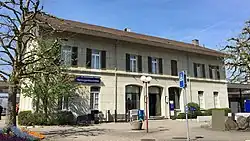 Das Aufnahmegebäude wurde vom damaligen Hochbaudirektor der Schweizerischen Centralbahn Ludwig Rudolf Maring als Typenbau entworfen in den Jahren 1856 und 1857 errichtet. Es handelt sich um einen mittelgrossen Typ, vergleichbar mit den Bahnhöfen Aarburg und Burgdorf.[9][10]