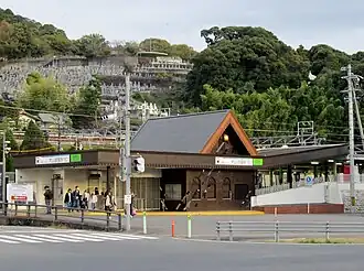 Der Bahnhof befindet sich an der Grenze zwischen den Stadtteilen Terashita im Westen und Zuisenji im Osten, etwa hundert Meter von der Brücke über den Kiso entfernt. Die Umgebung ist sehr touristisch geprägt; in der Nähe befinden sich die Burg Inuyama aus dem 15. Jahrhundert, der Zenkojisan-Park, die buddhistischen Tempel Zuisen-ji, Ryosai-ji, Rinkei-in und Naritasan Nagoya Betsuin Daisho-ji sowie der Japan Monkey Park, der einen Vergnügungspark und einen auf Affen spezialisierten Zoo umfasst. Die ebenerdige Anlage ist von Süden nach Norden ausgerichtet und umfasst zwei Gleise, die beide dem Personenverkehr dienen. Sie liegen an zwei Seitenbahnsteigen, die jeweils in ein separates Empfangsgebäude integriert sind. Verbunden sind sie durch einen Personentunnel, der mittels Rampen zugänglich ist.