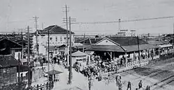 Die Bahngesellschaft Aichi Denki Tetsudō (Aiden) ergänzte am 31. August 1913 die seit einem Jahr bestehende Tokoname-Linie um den Abschnitt zwischen Denma-chō und Jingū-mae, womit die nach Tokoname führende Strecke nun vollständig in Betrieb war.[3] Vor dem Bahnhof führte ein eingleisiger Viadukt von der West- zur Ostseite der Tōkaidō-Hauptlinie; dort entstand auch die Aiden-Betriebszentrale. Vor und nach der Brücke gab es enge Kurven (100 m Radius) und eine Steigung von bis zu 27,8 ‰, so dass eine Geschwindigkeitsbegrenzung von 20 km/h galt.[4] Die Gründe für die Mühe, die Hauptlinie zu überqueren waren die Rücksichtnahme auf den Güterverkehr, die Vorwegnahme der Verlängerung der Aiden-Strecke in Richtung Innenstadt sowie der Bau der Arimatsu-Linie (spätere Meitetsu Nagoya-Hauptlinie). Jedenfalls waren die Baukosten für die Brücke und die Kanalquerung enorm, und Aiden geriet in finanzielle Schwierigkeiten. Das Unternehmen beeilte sich deshalb, die Arimatsu-Linie zu bauen, um die Rentabilität zu verbessern.[5] So ging der Abschnitt von Jingū-mae nach Moto Kasadera am 7. März 1917 in Betrieb[6], am 8. Mai desselben Jahres reichte die Strecke bis Arimatsu.[7]