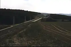 ![]() Blick auf den Betriebsbahnhof Richtung Norden mit Trockener-Mülmisch-Talbrücke und Kehrenbergtunnel im Hintergrund (Bauphase, ca. 1989).