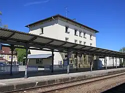 Im Jahr 1872 wurde das Empfangsgebäude als ein dreistöckiger Ziegelbau mit schiefergedecktem Walmdach erbaut. Die Türen und Fenster sind symmetrisch angeordnet, an den Seitenwänden sind jeweils zwei Gesimsbänder vorhanden. Im Erdgeschoss verfügte das Gebäude über zwei Diensträume, davon einer für den Fahrdienstleiter, zwei Wartesäle, davon einer für die erste und zweite Klasse und einer für die dritte Klasse, und über einen Vorraum, der sich am Eingang zur Straßenseite befand. Im zweiten und dritten Stock waren Wohnungen für die Bahnbediensteten untergebracht. Seitlich des Empfangsgebäudes schloss ein einstöckiger Anbau mit Satteldach an. Nach der Inbetriebnahme der beiden mechanischen Stellwerke wurde im Dienstraum des Fahrdienstleiters im Empfangsgebäudes ein Befehlsstellwerk eingerichtet. In den 1930er Jahren wurde das Gebäude verputzt und die alten Sprossenfenster durch Ganzscheibenfenster ersetzt. Westlich des Gebäudes errichtete die Deutsche Reichsbahn einen zweigeschossigen Bau mit flachem Zeltdach, der an den eingeschossigen Anbau anschloss. Im Empfangsgebäude befanden sich nach dem Zweiten Weltkrieg ein Fahrkartenschalter, Warte- und Diensträume und im zweiten und dritten Stock Wohnungen für Bahndienstete. Seit 1979 befindet sich im Empfangsgebäude ein Drucktastenstellwerk. Von 1990 bis 1991 wurde das Gebäude renoviert, bis heute ist ein Fahrkartenschalter vorhanden.[2][9] Im Empfangsgebäude befindet sich ebenfalls ein öffentlich zugänglicher Warteraum.