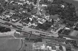 ![]() Gleise mit dem Wärterstellwerk dazwischen; am rechten Bildrand das Befehlswerk im Vorbau des Empfangsgebäudes