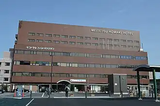 Ebenfalls gegen Ende des Pazifikkriegs begann der Bau einer kurzen Verbindungsstrecke zwischen der Iwakura-Zweiglinie und dem Bahnhof Shin-Komaki an der Komaki-Linie. Diese ging am 1. Mai 1945 in Betrieb, während der nicht mehr genutzte Kopfbahnhof der Iwakura-Zweiglinie stillgelegt wurde. Damit verbunden war am selben Tag auch die Umbenennung des Bahnhofs Shin-Komaki in Komaki.[7] Am 26. April 1964 legte die Meitetsu die Iwakura-Zweiglinie still[8] und 1968 gab sie den Güterumschlag auf.[9] 1977 begannen städtebauliche Planungen im Zusammenhang mit der Modernisierung des Stadtzentrums. Darin enthalten war auch eine Neutrassierung der Komaki-Linie, wodurch zahlreiche höhengleiche Bahnübergänge aufgehoben werden sollten. Ab 1983 entstand etwa 150 Meter östlich des bisherigen ebenerdigen Bahnhofs ein neuer Tunnelbahnhof mit den dazu gehörenden Zulaufstrecken. Die Inbetriebnahme erfolgte am 23. April 1989. Das Bahnhofsgebäude mit dem Meitetsu Komaki Hotel war im November 1990 fertiggestellt.[10]