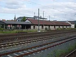 Empfangsgebäude des Bahnhofs Kronach mit den Bahnsteigen 2/3 und 4/5