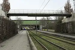 Quer zu den neuen Reiseverkehrsanlagen unterquert die Straßenbahnstrecke zum neuen Messegelände die Bahnanlagen. Treppen und Aufzüge verbinden die Bahnsteige beider Verkehrsmittel direkt miteinander.