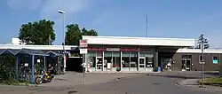 Das ursprüngliche Empfangsgebäude an der Ostseite der Bahnstation ist ein neuklassizistischer Putzbau und wurde im Jahr 1854 errichtet. Hinzu kam ein Toilettenhaus und ein Güterschuppen aus Holz, der 1992 abgerissen wurde.[5] Nach dem Zweiten Weltkrieg wurde ein neues Empfangsgebäude auf der westlichen Seite der Gleise in Betrieb genommen.