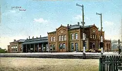 Der Bahnhof wurde 1865 eröffnet und entwickelte sich in den folgenden Jahrzehnten zu einem Eisenbahnknoten in der östlichen Oberlausitz, die damals zur preußischen Provinz Schlesien gehörte. Nach dem Ende des Zweiten Weltkriegs fielen die Gebiete östlich von Lausitzer Neiße und Oder und damit auch Lauban an Polen. Der Verkehrsknoten verlor nach dem Krieg stark an Bedeutung.