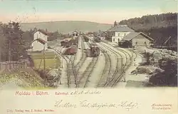 Der Bahnhof Moldava besteht seit der provisorischen Streckeneröffnung am 6. Dezember 1884. Er war von Anfang an als Grenzbahnhof zwischen Sachsen und Böhmen konzipiert. Die Königlich Sächsischen Staatseisenbahnen (K. Sächs. Sts. E.B.) bzw. später die Deutsche Reichsbahn (DR) besaßen für die Anlagen ein Mitnutzungsrecht auf Pachtbasis. In seiner größten Ausdehnung vor 1945 besaß der Bahnhof neun Gleise. An Hochbauten bestanden neben dem Empfangsgebäude ein vierständiges Heizhaus, zwei Güterschuppen (für jede Bahnverwaltung einen) und eine Wasserstation zur Versorgung der Dampflokomotiven.