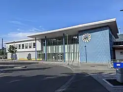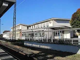 Das 1960[8] errichtete Empfangsgebäude des Bahnhofs wurde bis 2017 durch die Agentur für Arbeit genutzt, 2022 durch die Baugenossenschaft Rhein-Lahn.