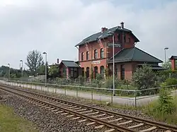 Das traufständige Empfangsgebäude wurde aus Backsteinen errichtet und verfügt über zwei Hauptgeschosse und ein Dachgeschoss unter einem Krüppelwalmdach. Nördlich schließt ein einstöckiger Anbau mit Walmdach an, der über ein von hölzernen Stützen getragenes Vordach verfügt. Südlich befindet sich ein eingeschossiger Fachwerkbau mit Flachdach, der dem Güterverkehr diente. Das Empfangsgebäude befindet sich heute in Privatbesitz.