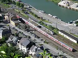 Die Verkehrsstation selbst verfügt über drei Bahnsteiggleise. Der Hausbahnsteig an Gleis 1 hat eine Höhe von 38 cm und eine Länge von 283 m. Von ihm gelangt man durch eine Personenunterführung zum Mittelbahnsteig, der an den Gleisen 2 und 3 liegt. Er hat ebenfalls die Höhe von 38 cm und eine Länge von 322 m.[2] In der Regel fahren die Züge Richtung Mainz von Gleis 1 und die Züge Richtung Koblenz von Gleis 2 ab. Gleis 3 wird lediglich von Zügen genutzt, die hier beginnen oder enden bzw. (planmäßig oder außerplanmäßig) überholt werden.