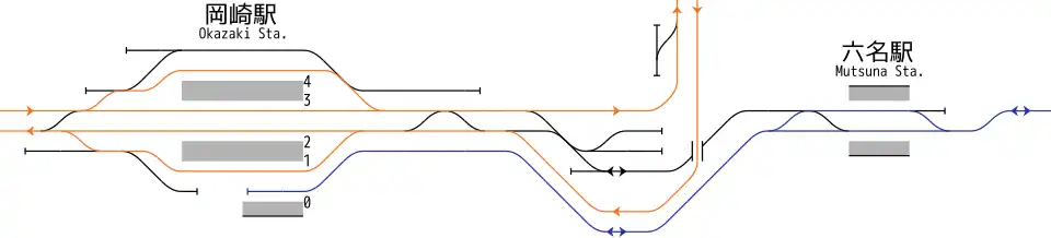 An Werktagen verkehren auf der Tōkaidō-Hauptlinie tagsüber sieben bis acht Züge je Stunde, während der Hauptverkehrszeit bis zu elf. Es gibt vier Gattungen von Eilzügen. Allen gemeinsam ist, dass zwischen Toyohashi und Gifu die Anzahl der Halte variiert (zwischen Gifu und Maibara halten die Züge hingegen an allen Bahnhöfen). Ihre Bezeichnungen lauten „Special Rapid“ (特別快速, Tokubetsu kaisoku), „New Rapid“ (新快速, Shin kaisoku), „Rapid“ (快速, Kaisoku) und „Semi Rapid“ (区間快速, Kukan kaisoku). Hinzu kommen Lokalzüge mit Halt an allen Bahnhöfen zwischen Gifu und Toyohashi, wobei etwa die Hälfte in Okazaki wendet.[1] Auf der Aichi-Ringlinie verkehren Lokalzüge mit Halt an allen Bahnhöfen im 16-Minuten-Takt über Shin-Toyota zum Bahnhof Kōzōji.[2] Auf beiden Bahnhofsvorplätzen gibt es je einen Busterminal mit mehreren Haltestellen, die von insgesamt acht Buslinien der Gesellschaft Meitetsu Bus bedient werden.