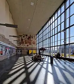 Nach Kriegsende wurden aufgrund zahlreicher Störungen vorerst nur Notbehelfe gebaut, die teilweise bis in die 1970er Jahre existierten. Für das 1945 komplett zerstörte Empfangsgebäude wurde beispielsweise eine einfache Baracke errichtet, die erst mit dem am 21. Dezember 1973 eingeweihten, heute noch betriebenen Empfangsgebäude ersetzt werden konnte.[5] Dieser Neubau in Seitenlage entsprach den Planungen um die Jahrhundertwende. Baubeginn war 1970, das Richtfest wurde im Frühjahr 1972 gefeiert. Die Baukosten des Bahnhofes beliefen sich auf 58 Millionen Mark. Der Zweckbau[6] mit der charakteristischen Vorhangfassade aus türkisblau emaillierten Stahl-Aluminium-Verbundprofilen[7] steht seit 2008 unter Denkmalschutz[8]. In der Wandhalle hinter der markanten Glas-Alufront[9] prangt eine Kupferwandgestaltung der Künstler Martin Schmidt und Walter Rahm mit dem Titel „Die Stadt Plauen und ihre Bürger“[7][10]. Der Bahnhof hatte weiterhin eine große Bedeutung im Verkehr, so nutzten etwa 10 000 Reisende täglich den Bahnhof;[11] zahlreiche Fernverkehrszüge fuhren den Bahnhof an, darunter auch internationale Fernzüge wie der Karlex.