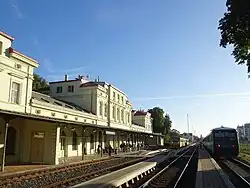 Das Bahnhofsareal steht seit dem 8. März 1999 unter Denkmalschutz. Dazu die gehören die drei Teilobjekte: Stationsgebäude, Dienstgebäude und Wasserstation.[4] Das Stationsgebäude steht an der Nordseite der Gleise. Es ist ein symmetrischer Bau im Stil der Neorenaissance, besteht aus drei zweigeschossigen Bauteilen aus vier Achsen in den Seitenteilen und sieben im Zentralteil. Diese sind durch zwei einstöckiger sechsachsige Teile verbunden. Im zentralen Teil befindet sich die Fahrkartenausgabe, im östlichen eine Gaststätte. Der frühere Wartesaal 1. Klasse wurde 1937 in einen Salon für den tschechoslowakischen Präsidenten Tomáš Garrigue Masaryk umgebaut, der vom Bahnhof regelmäßig zu seinem Sommersitz im Schloss Lány reiste. Masaryk erlebte die Fertigstellung des Salons nicht mehr.[5]