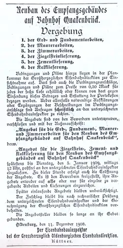 Schließlich war der Beschluss der Großherzoglich Oldenburgischen Eisenbahndirektion zur Errichtung eines Empfangsgebäudes eingetroffen. Nach Erwerb der erforderlichen Grundstücke wurde mit dem Bau nach einem Entwurf des Architekten Köhler aus Oldenburg begonnen. Die Oberleitung lag in den Händen von Oberbauinspektor Küttner, ebenfalls aus Oldenburg, die örtliche Ausführung wurde von Bahnmeister Krück besorgt.[2]