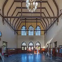 Das neogotische Empfangsgebäude ist im Inneren mit 1906 neugestalteten Glasmalereien versehen. Diese wurden von der Firma Müller hergestellt und stellen Ansichten des Schlossberges und des Rathauses dar.[19] Der Bahnhof ist im Quedlinburger Denkmalverzeichnis eingetragen.