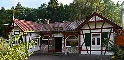 Das ehemalige Empfangsgebäude ist im Stil eines pittoresken Gartenhauses erbaut. Das teilunterkellerte Gebäude besteht aus drei Gebäudeflügeln, einem parallel zur Bahnlinie verlaufenden Haupttrakt und zwei unterschiedlich langen Seitenflügeln zur Bahnsteigseite. Es ist in Sichtfachwerk erstellt. Früher gehörte ein separates Toilettenhäuschen zum Ensemble. Das ehemalige Empfangsgebäude ist ein Kulturdenkmal nach dem Hessischen Denkmalschutzgesetz und wird heute als Restaurant genutzt.
