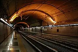 Der Bahnhof liegt in einem zweigleisigen Tunnel und hat zwei Seitenbahnsteige. Vom Empfangsgebäude führt ein rund 700 m langer Fußgängertunnel mit zwei Fahrsteigen zu den Bahnsteigen. Betrieblich handelt es sich um eine Haltestelle mit Außenbahnsteigen.
