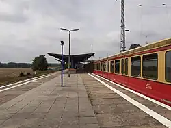 Der Bahnhof wurde in der typischen Anordnung der Bahnhöfe des Berliner Außenrings mit zwei Durchgangsgleisen und zwei von ihnen nach außen abzweigende Bahnsteiggleisen errichtet, die über eine Fußgängerbrücke verbunden sind.[12] Mit der Trennung von S- und Fernbahn Anfang der 1980er Jahre wurde südlich anschließend ein separater Mittelbahnsteig für die S-Bahn mit zwei Gleisen errichtet, der von der Fußgängerbrücke durch ein Passimetergebäude zu erreichen ist. Dort befand sich früher die Fahrkartenausgabe. Das nördliche Bahnsteiggleis des Fernbahnteils ist abgebaut worden, das südliche ist noch in Betrieb.[13] Der nördliche Teil der Fußgängerbrücke ist gesperrt. Das Gelände jenseits der Gleise ist über einen Bahnübergang westlich der Bahnsteige zu erreichen. Dabei handelt es sich um einen der wenigen beschrankten Bahnübergänge sowohl im Netz der Berliner S-Bahn als auch am Berliner Außenring. Die alte WSSB-Schrankenanlage wurde im Jahr 2012 durch eine neue Halbschrankenanlage von Siemens ersetzt.