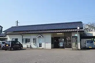 Der Bahnhof steht im Stadtteil Motoshigechō, etwas nördlich des eigentlichen Stadtzentrums. Die ebenerdige Anlage ist von Süden nach Norden ausgerichtet und umfasst drei Gleise, von denen zwei dem Personenverkehr dienen. Diese liegen an zwei teilweise überdachten Seitenbahnsteigen, die über einen Bahnübergang miteinander und mit dem hölzernen Empfangsgebäude an der Westseite verbunden sind. Das westlichste endet stumpf und dient dem Abstellen von Zügen. An der Ostseite steht eine dreigleisige Depothalle, in der kleinere Wartungsarbeiten durchgeführt und nachts Züge abgestellt werden. Auf dem Bahnhofsvorplatz befand sich einst die Endstation einer Überlandstraßenbahn, bestehend aus einem Stumpfgleis und einem kleinen Wartehäuschen.