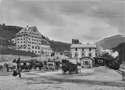 Das erste Aufnahmegebäude wurde von A. Ludwig entworfen, der auch die Bauleitung innehatte. Die Baukosten werden mit 90'000 CHF angegeben.[3] Das Gebäude wurde vom Baumeister Huder aus Davos erbaut. Der Bau bestand wegen des rauen Klimas und der zu dieser Zeit sehr hohen Holzpreise aus verputzten Bruchsteinen. Es handelte sich um einen dreigegliederten Bau mit zwei erhöhten Endbauten, die mit einem niedrigen Mittelbau verbunden waren. Das Gebäude wurde 1927 durch den heutigen Bau ersetzt.