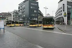 Die örtlichen STI Bus betreiben insgesamt zwölf Bussteige in unmittelbarer Umgebung des Bahnhofs. Die meisten sind gegenüber dem Empfangsgebäude platziert.[9] Der Bahnhof Thun ist Hauptknoten der STI, welche den Bahnhof mit insgesamt 20 Linien bedient.[10] Von 1913 bis 1958 hielt die Strassenbahn Steffisburg–Thun–Interlaken am Bahnhof Thun, die von 1952 bis 1982 teilweise durch Trolleybus Thun–Beatenbucht ersetzt wurde.