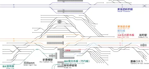 Der Bahnhof steht im zentralen Stadtteil Ekimae-Ōdōri. Die Anlage ist von Südosten nach Nordwesten ausgerichtet und in drei Teile gegliedert. Ganz im Westen befindet sich der Shinkansen-Teil mit einem Mittel- und einem Seitenbahnsteig. Die Hochgeschwindigkeitszüge halten auf drei Gleisen, auf zwei weiteren fahren sie durch. Im Gegensatz zu den meisten Shinkansen-Bahnhöfen Japans sind die Gleise nicht auf einem Viadukt verlegt, sondern ebenerdig.[4] Dem Personenverkehr des konventionellen Schienennetzes stehen acht Gleise zur Verfügung. Züge der Tōkaidō-Hauptlinie nutzen zwei Mittel- und einen Seitenbahnsteig auf der Ostseite, Züge der Iida-Linie und der Meitetsu Nagoya-Hauptlinie teilen sich drei stump endende Gleise im Kopfbahnhofteil. Über ein Dutzend weitere Gleise werden als Abstellanlage oder für durchfahrende Güterzüge genutzt. Etwa einen halben Kilometer nördlich steht ein Bahnbetriebswerk, im rund zwei Kilometer nördlich gelegenen Containerterminal wickelt JR Freight den Güterverkehr ab.