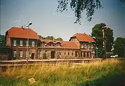 Das Empfangsgebäude ist ein gelber zweigeschossiger Ziegelbau, der im Jahr 1894 errichtet wurde. Die Planungen stammten vom Technischen Bureau der Königlichen Eisenbahn-Direktion Erfurt. Eine Erweiterung folgte zwei Jahre später. Auftraggeber war diesmal die Königliche Eisenbahndirektion Halle. Die letzte Erweiterung fand 1913 durch das Königliche Eisenbahnbetriebsamt Luckenwalde statt.[9]