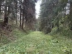 Um 2003 schließlich wurden im Bahnhof vollumfänglich die Gleise erneuert.[45] Dabei wurde die Gleisanlage maximal vereinfacht und der Bahnhof Ungerhausen erhielt seine heutige (Stand 2024) Form.[46] Erhalten blieb neben dem Streckengleis lediglich das südliche Nebengleis, entsprechend den früheren Bahnhofsgleisen 2 und 3.[46] Das Bahnhofsgleis 1 wurde mitsamt dem Ladegleis entfernt, ebenso die Reste des Bundeswehr-Anschlusses.[46] Der Bahnhof Ungerhausen verfügt seitdem nur noch über zwei Weichen.[46] Auch die alten Schüttbahnsteige wurden im Zuge der Renovierung ersatzlos abgetragen.[46] Die Nutzlängen der beiden verbliebenen Gleise sind im Infrastrukturregister angegeben mit 525 bzw. 671 Metern.[47]