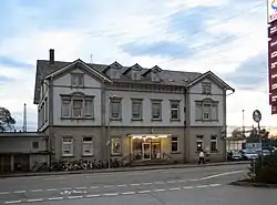 Das Empfangsgebäude befindet sich auf der nördlichen Seite des Bahnhofs. Es handelt sich um einen von Spätklassizismus und Neurenaissance geprägten Bau, welcher etwa um 1870 erbaut wurde. Auf seiner der Straße zugewandten Seite enthält er außerdem Risalite.[27] Das Gebäude steht unter Denkmalschutz.[28]