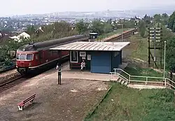 Das Empfangsgebäude wurde 1904 im Jugendstil erbaut und befand sich unterhalb des erhöhten Bahndamms. Im Zweiten Weltkrieg wurde das Gebäude erheblich zerstört und verwahrloste zusehends, seit den 1960er Jahren befindet es sich im wechselnden privaten Besitz und ist heute ein Schulungszentrum von Siedle.[9] Als Ersatz wurde ein schlichter Bau direkt am Bahnsteig genutzt, der auch das Stellwerk enthielt.