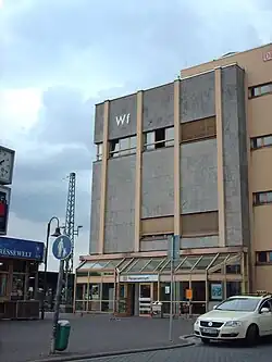 Vor dem ersten Empfangsgebäude wurde ein im Januar 1917 vollendetes Jugendstil-Empfangsgebäude errichtet. Dieses wurde 1944/45 stark beschädigt und konnte nur noch behelfsmäßig wieder hergerichtet werden.[2] Im Zuge der Modernisierung der Stellwerkstechnik wurde es um 1985 abgerissen. An seine Stelle trat ein moderner Funktionsbau, der neben einem Warteraum und dem Reisezentrum hauptsächlich das 1986 in Betrieb genommene Relaisstellwerk (Bauform SpDrS 600) beinhaltet.