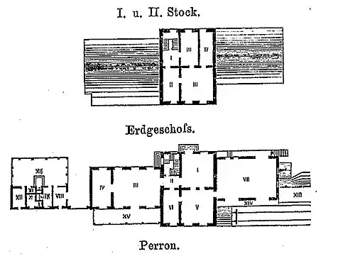 Im Erdgeschoss: I: Vestibül, II: Durchgang, III/IV: Warteräume für 3. und 4. bzw. 1. und 2. Klasse, V: Fahrkarten- und Gepäckschalter, VI: Stationsaufseher, VII: Güterschuppen, VIII–XII: Spritzenraum, Toiletten und Ställe, XIII: Viehrampe, XIV: Laderampe; XV: Halle (offener überdachter Unterstand zum Bahnsteig hin).