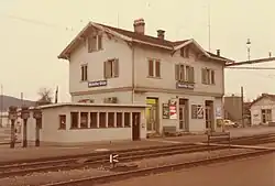 Das Bahnhofsgebäude befindet sich südwestlich aller Streckengleise.