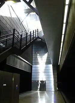 ![]() Oberirdisches «Schiff» im Flussbett der Sihl, nördlicher Zugang zum unterirdischen Bahnhof (2009)