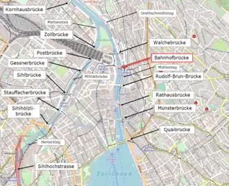 Die Schweizerische Nordbahn (SNB) verband ab 1847 Zürich mit Baden, wobei der Bahnhof schon damals an der Stelle des heutigen Zürcher Hauptbahnhofs angelegt wurde. Der Standort auf der Landzunge zwischen Sihl und Limmat kurz vor deren Zusammenfluss der beiden Flüsse war schlecht an die damalige Stadt angebunden: Er lag nördlich der Stadt links der Limmat und konnte nur über eine kleine Brücke über den Schanzengraben erreicht werden. Der Schanzengraben mündete damals noch oberhalb des Bahnhofs in die Limmat, nicht wie heute bei der Gessnerallee in die Sihl. Die rechtsufrige Stadt war über den Langen Steg mit dem Bahnhof verbunden. Diese Holzbrücke aus dem Jahre 1662[1] konnte von schweren Fuhrwerken nicht befahren werden. Sie konnten den Bahnhof nur über die Rathausbrücke erreichen.