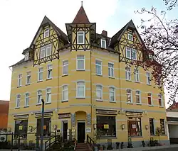Das Gebäude ist dreigeschossiger Putzbau mit Dekorelementen und mittigem Turm. Durch seine Lage und Gestaltung ist es prägend für das Stadtbild. Wenige Meter entfernt liegt das ebenfalls denkmalgeschützte ehemalige Spritzenhaus Türmchen, dass seit 1976 als Gaststätte dient.