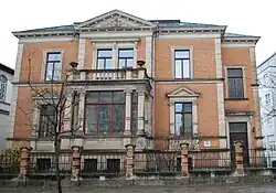 Die Grundstückseinfriedung erfolgte durch Pfeiler mit gusseisernen Zaunfeldern.