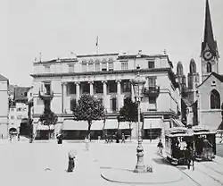Von den zahlreichen Banken, die bis heute an der Bahnhofstrasse angesiedelt sind, war die Meisenbank die erste. Sie etablierte sich 1872 auf dem Platz vor der alten Hochschule; 1875 bezogen Leu & Cie. ihren ersten Bau. Die Schweizerische Kreditanstalt, die bis 1868 im alten Postgebäude «Zum Zentralhof» untergebracht war, baute von 1873 bis 1876 ihren «Palast» am Paradeplatz, der heute noch steht.[6][7]