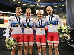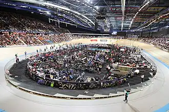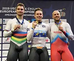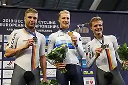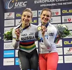 Europameister im Zweier-Mannschaftsfahren (v. l. n. r.): Lasse Norman Hansen, Julie Leth, Amalie Dideriksen und Michael MørkøvSilber in der Mannschaftsverfolgung für den deutschen Frauen-Vierer (v. l. n. r.): Mieke Kröger, Lisa Klein, Gudrun Stock, Franziska Brauße und Lisa BrennauerDie russischen Fahrerinnen Anastassija Woinowa (r.) und Darja Schmeljowa dominierten erneut die Kurzzeitdisziplinen Podium Einerverfolgung (v. l. n. r.): Domenic Weinstein, Corentin Ermenault und Felix GroßDie ersten Drei im Keirin (v. l. n. r.): Matthijs Büchli (3.), Harrie Lavreysen (1.) und Denis Dmitriev (2.)Blick auf die Tribüne