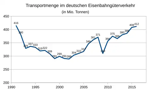 Trotz des Eintritts der privaten EVUs in den Güterverkehrsmarkt sank die Beförderungsmenge zunächst von 337 Millionen Tonnen (1994) auf 299 Millionen Tonnen (2000) und erreichte erst 2006 mit 346 Millionen Tonnen das Niveau von 1994. Nach konjunkturbedingtem Einbruch 2009 stiegen die Transportmengen wieder an und erreichten 2017 mit 412 Millionen Tonnen das Niveau von 1991. Die Transportweiten und somit die Beförderungsleistung stiegen von 70 Milliarden Tonnenkilometer (1994) auf 86 Milliarden Tonnenkilometer (2004) an und erreichte mit 115,7 Milliarden 2008 einen Höhepunkt, bevor sie konjunkturbedingt 2009 auf das Niveau von 2005 einbrach, sich anschließend aber wieder erholte und bis 2017 auf 129 Milliarden Tonnenkilometern stiegen, etwa doppelt so viel wie 1993.[25][26][27][21] Der Anteil privater EVUs an den Güterverkehrsleistungen stieg von 1,3 % (1993) über 1,9 % (2000), 24,5 % (2009) auf 47 % (2017).[15][21] Der Modal Split nahm zunächst von 16 % auf 15 % (2000) ab und stieg seitdem bis auf 19,3 % (2017).[15][21]